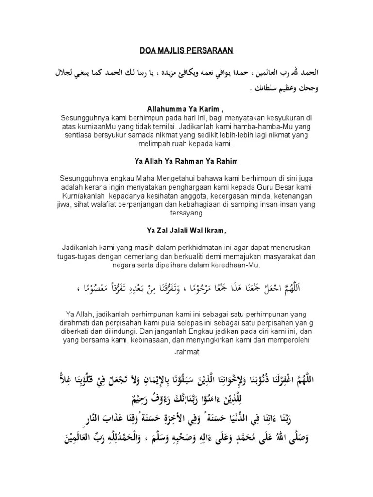 Ya allah ya tuhan kami, jadikanlah pertemuan ini sebagai pertemuan yang dirahmati, dan jadikanlah perpisahan ini sebagai perpisahan yang . Teks doa majlis persaraan dan perpisahan k14. Ya rahman ya rahim wahai tuhan kami rahmatilah kami pada hari ini iaitu majlis persaraan en. Ya zal jalāli wal ikrām,. Doa majlis perpisahan pegawai dan kakitangan بِسْمِ اللهِ الرَّحْمـنِ الرَّحِيْمِ ا اَلْحَمْدُ ِللهِ رَبِّ الْعَالَمِيْنَ وَالْعَاقِبَةُ .